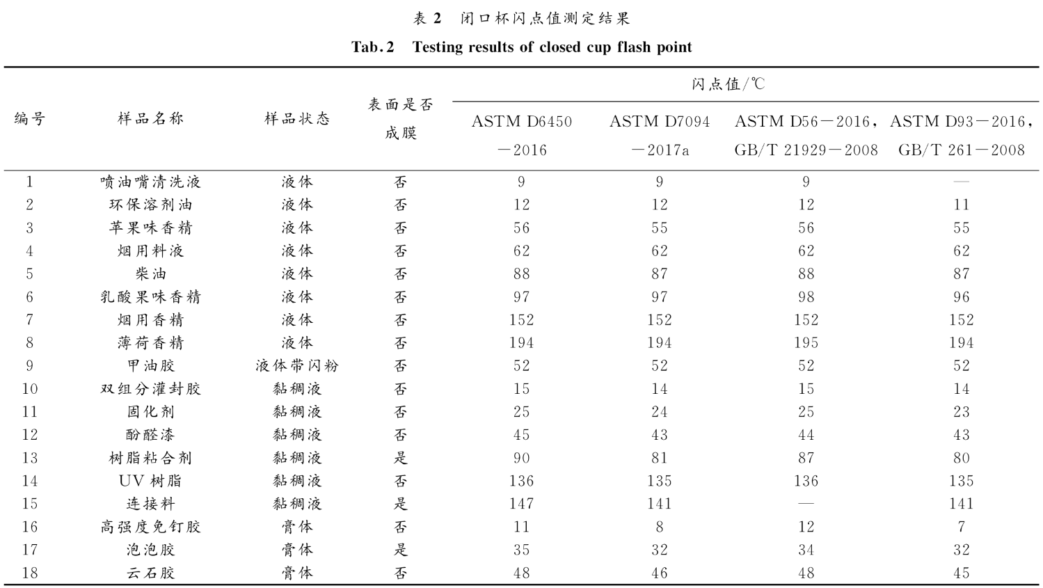 根據(jù)狀態(tài)及閃點范圍,選擇具有代表性的樣品作為研究對象。用不同的測試方法對同一樣品進行閉口杯閃點測定,測定結(jié)果見表2 。由表2可知,對于液體樣品,不同的測試方法測定的閉口杯閃點值基本一致,最大差值出現(xiàn)在乳酸果味香精樣品上。其他樣品使用不同測試方法測定的結(jié)果差值都不超過1℃ 。對于檢測過程中表面不成膜的黏稠液體樣品,測出的閃點值要小得多。對于膏體樣品,按照不同標準測定閃點值的情況與黏稠液體的情況相似。對采用不同測試方法測得的不同狀態(tài)樣品的閉口杯閃點值進行分析比較,可見在檢測過程中,測試時樣品用量只需1mL ,方法操作簡單快捷,且其測定的閃點值與其他測試方法的測定結(jié)果基本一致;測定表面不成膜的黏稠液體樣品,建議按照進行測試,該方法的樣品用量只需2mL ,且檢測過程中帶有攪拌子可使樣品受熱均勻;檢測表面不成膜的 膏 體 樣 品,由于其 對流傳熱慢 ,故按照上海昌吉SYD-5208D快速低溫閉口閃點試驗器使用升溫速率較慢的測試方法更加合適;對于表面成膜的樣品,為了避免檢測過程中試樣表面的膜阻擋易燃蒸汽的逸出而影響閃點值的檢測結(jié)果,則推薦采用在檢測過程中帶有攪拌功能的測試方法。