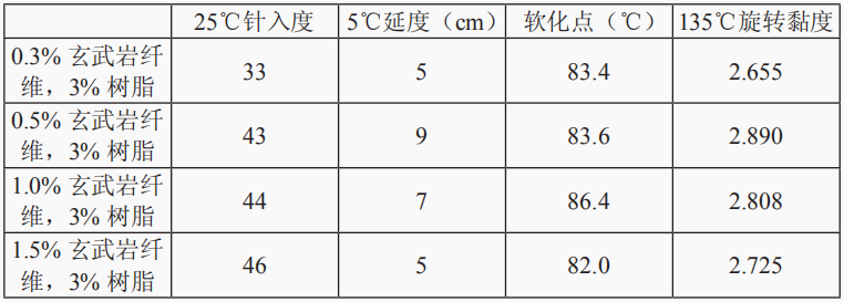 上海昌吉地質儀器有限公司在制備高粘瀝青時采用高溫穩定性良好的SBS改性瀝青,實驗時向SBS改性瀝青中摻入一定量樹脂和玄武巖纖維,試件重600g,纖維采用長6mm短切玄武巖纖維。分別進行瀝青三大性能指標試驗和旋轉度試驗。根據實驗結果可知,隨著玄武巖纖維含量增加,試件的針入度上升,說明瀝青稠度增加,高溫穩定性提高。延度先上升后下降,說明加入纖維對混合料高溫性能產生一定影響。與未摻加纖維相比,延度整體降低,但低溫抗裂性能仍在合理范圍內。瀝青軟化點逐漸升高,在摻量為1%時達到峰值,隨后下降,說明高溫性能得到改善。旋轉黏度先升高后降低,與SBS改性瀝青相比黏度有明顯提高。