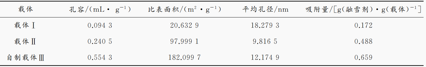 由表1可知,載體I為小孔容、小比表面積、大孔徑型Al203載體;而載體Ⅱ、自制載體Ⅲ為大孔容、大比表面積、小孔徑型Al203載體。而就載體吸附融雪抑冰活性物質(zhì)來(lái)衡量,從求得高吸附量、大比表面積和小孔徑指標(biāo)來(lái)看,自制載體Ⅲ最符合試驗(yàn)要求。